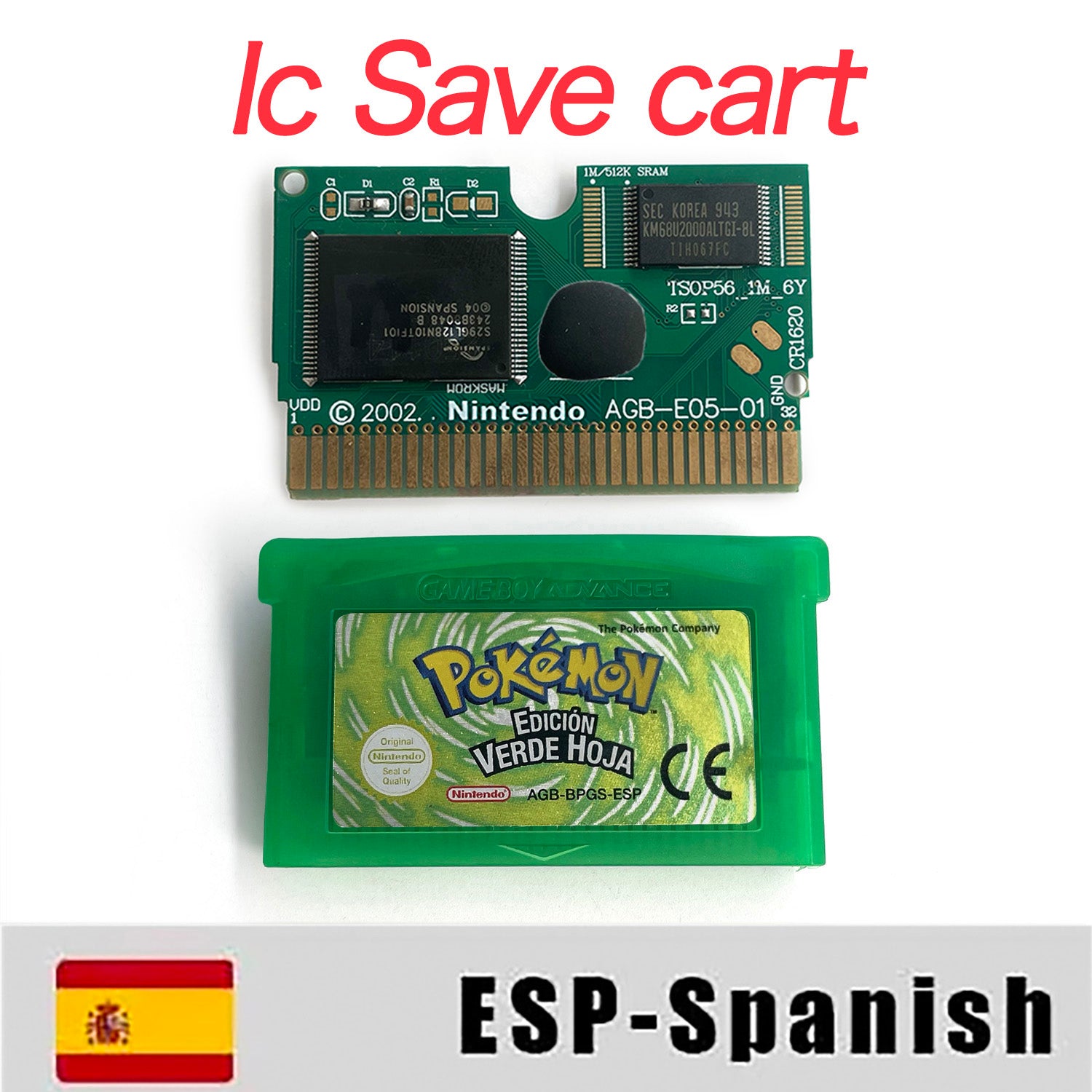 ESP Spanish IC save 1 M flash cart pokemon leafgreen version box with tray Nintendo game cartridge for gba